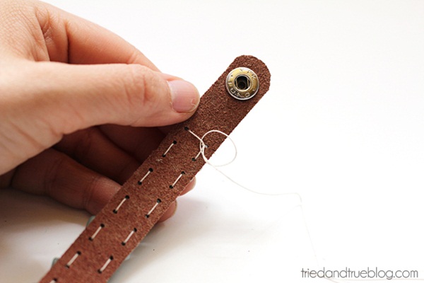 1. เริ่มด้วยการนำสายข้อมือหนังมาเจาะรูด้วยตัวตอกหนังค่ะ โดยเจาะให้เป็นสองรูขนานกันไปทั้งเส้น(ตามรูป) นำเอ็นผูกปมแล้วร้อยเข้ากับรูแรกของหนัง จากนั้นร้อยหินธรรมชาติที่เราชอบกับเอ็น