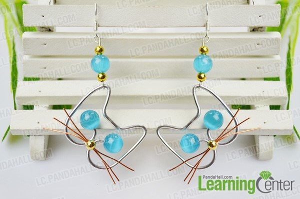 4. เกี่ยวตะขอต่างหูเข้ากับเข็มเลขเก้าที่เราร้อยลูกปัดไว้ เสร็จแล้วค่ะต่างหูน้องแมวของเรา