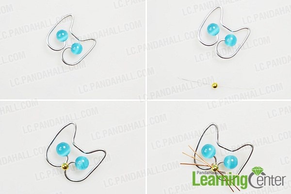 2. หยิบลูกปัดตาแมวมาเสียบส่วนปลายของลวดดัดสีเงินเหมือนเป็นตาของแมวค่ะ จากนั้นร้อยลูกปัดทองเหลืองกับลวดดัดสีทอง แล้วนำไปพันระหว่างลวดดัดสีเงินที่ดัดเป็นหน้าแมวเพื่อเป็นจมูก(ตามรูป) ก่อนจะใช้ลวดดัดสีทองร้อยเข้าไปในลูกปัดทองเหลืองทั้งหมด 3 เส้น (ตามรูป) เราก็จะได้หน้าน้องแมวมาแล้ว ทำแบบนี้เตรียมไว้ทั้งหมด 2 ชิ้นนะคะ